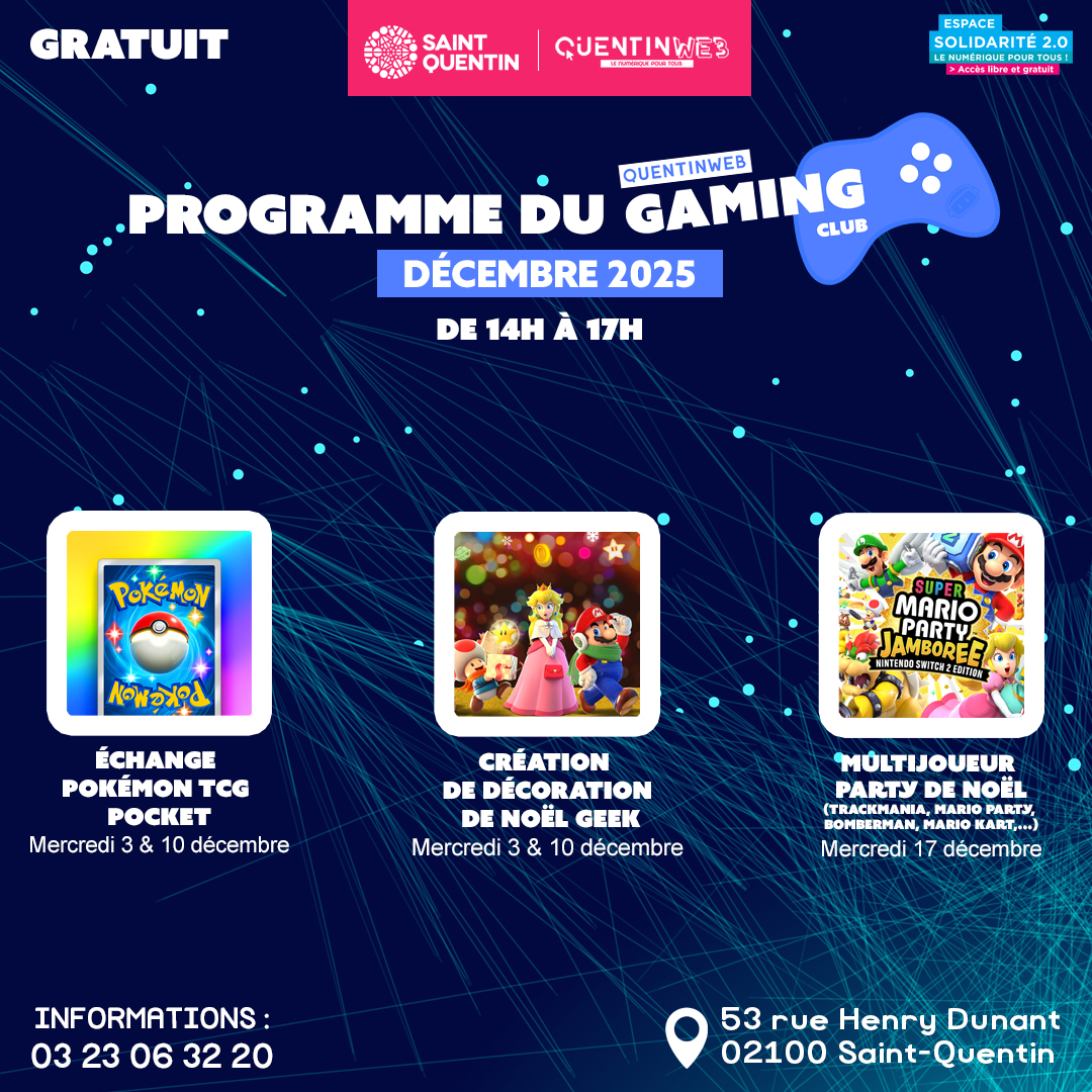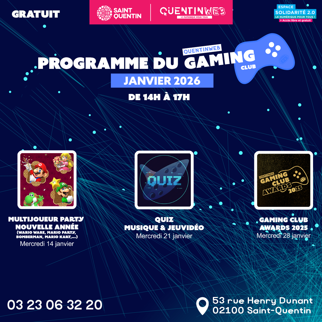 Le QuentinWeb Gaming Club, c’est le rendez-vous entièrement dédié aux passionnés de jeux vidéo. Des tournois palpitants, des compétitions d’e-Sport, des rencontres entre gamers, de la création numérique autour du JV, des quiz interactifs, et des débats passionnés sur l’actualité du jeu vidéo.